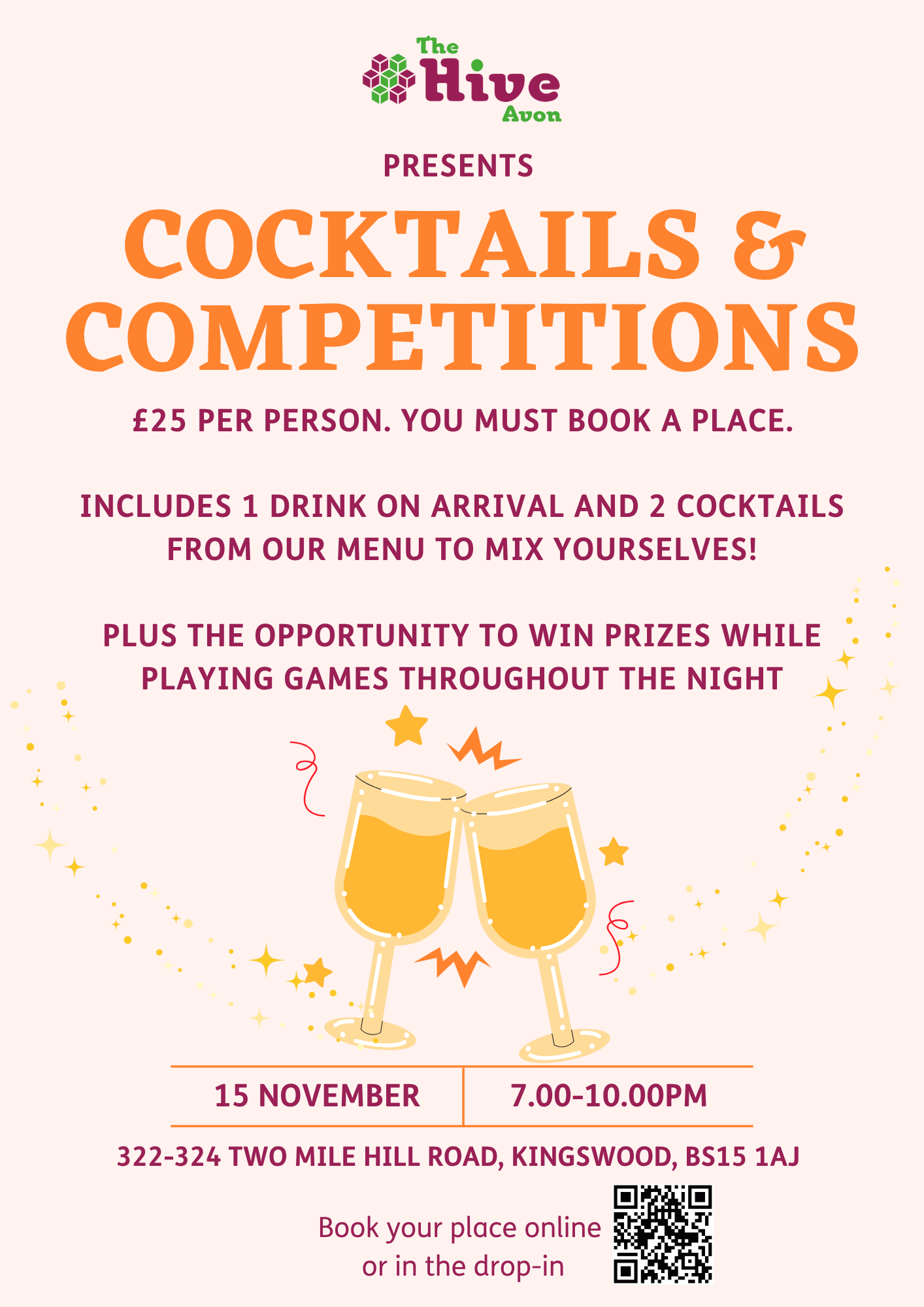 On Saturday 15 November we are holding a Cocktails & Competitions Night at The Hive Drop-in. The event starts at 7pm and ends at 10pm.
